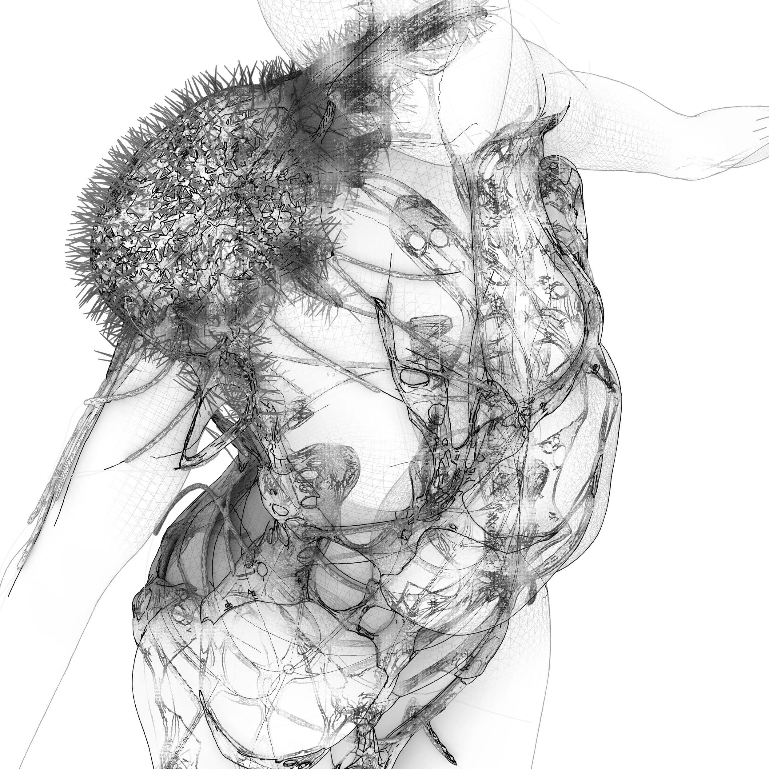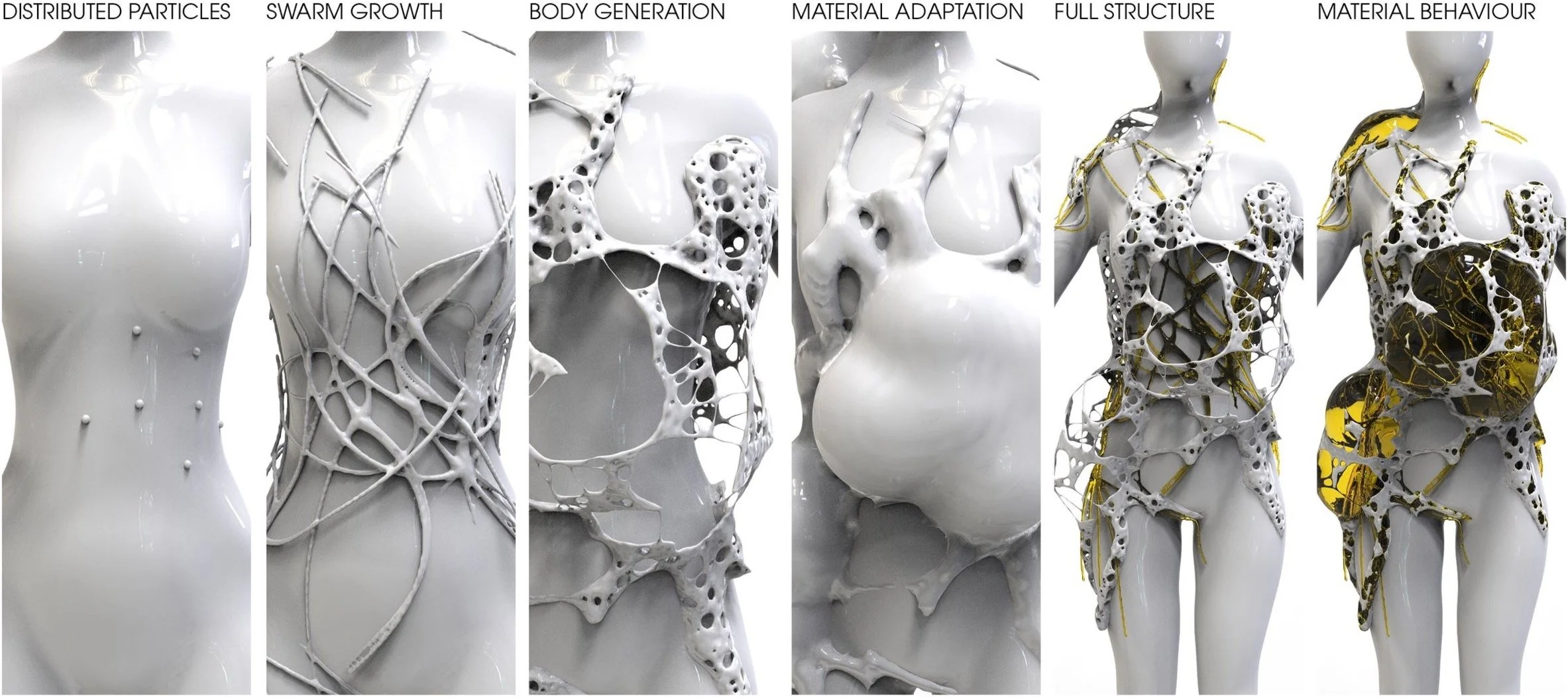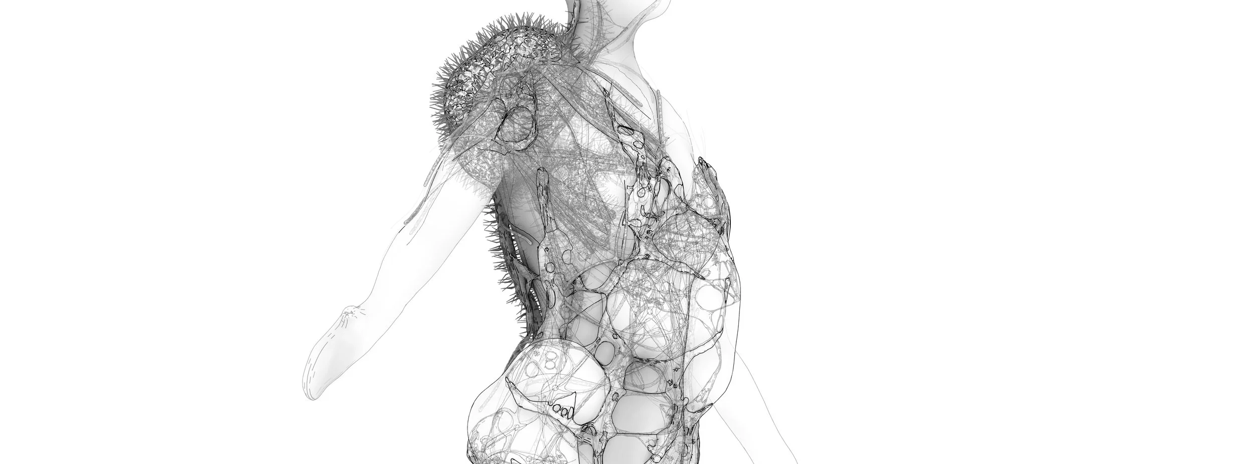 BIONIC BUBBLE is a generated skin, functioning as a living body that represents the boundary surrounding an individual. This wearable translates information into matter by deforming and transforming material. By augmenting the perception of bodily limits, the project aims to create responsive and action-oriented membranes for dynamically generated bodies.